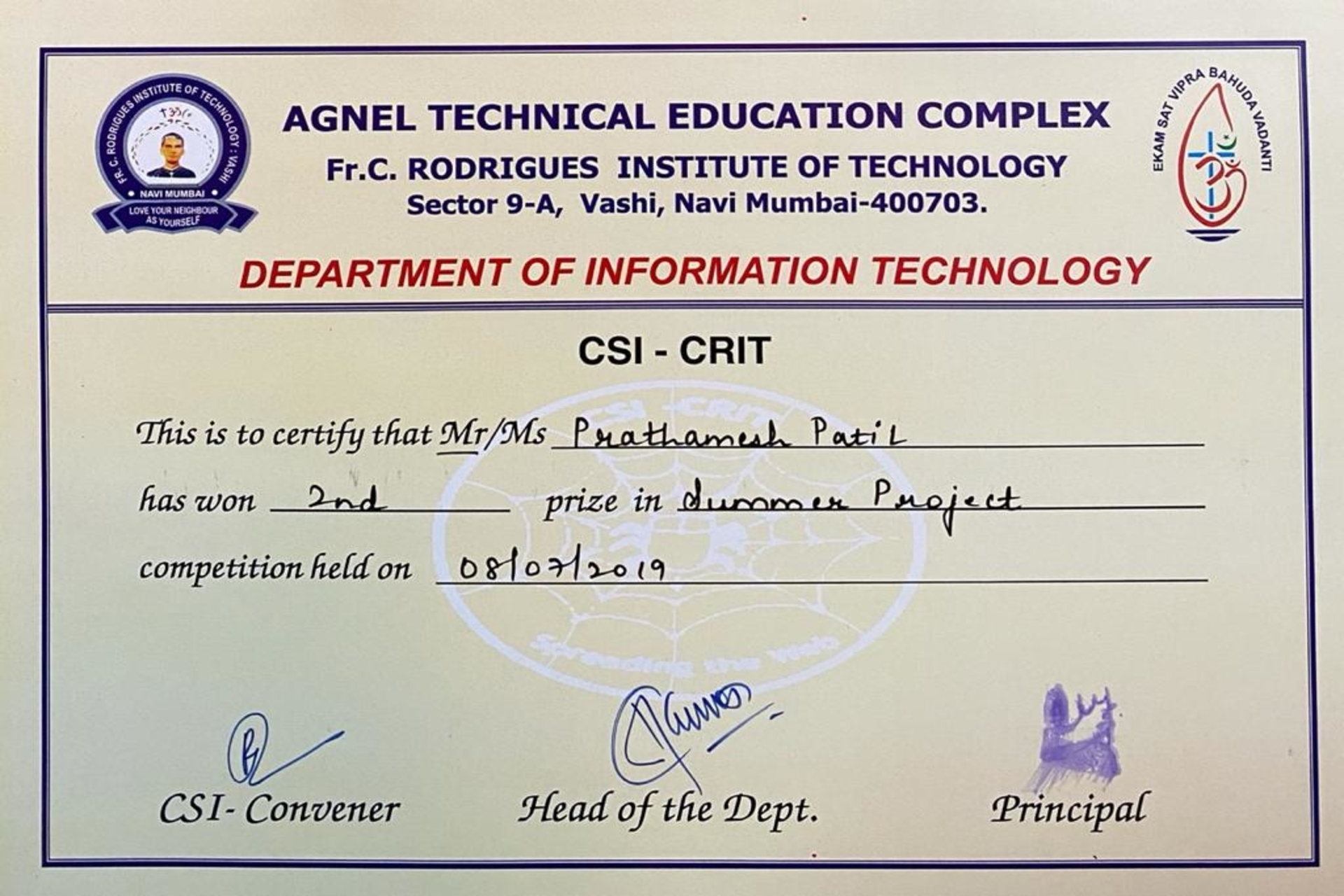 Won 2nd prize in Summer Project compitation held on 08/07/2019